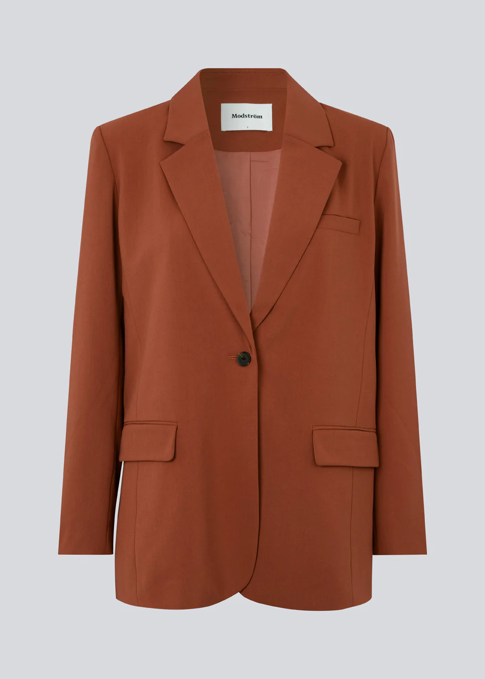 Oversized blazer i farven maple med blødt fald. AnkerMD blazer har krave og revers samt en knap foran. Forlommer med klap og brystlomme. Slids bagpå og ved ærmer. Med for.