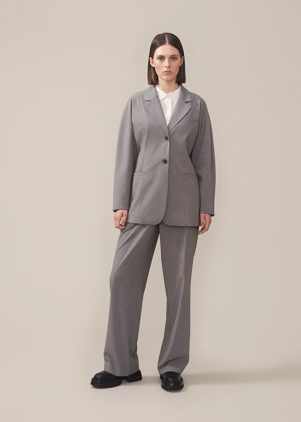 Figursyet blazer i grå med voluminøse ærmer og bløde lommer, samt krave og revers. Uden slids bagpå. Modellen er 176 cm og har en størrelse S/36 på.