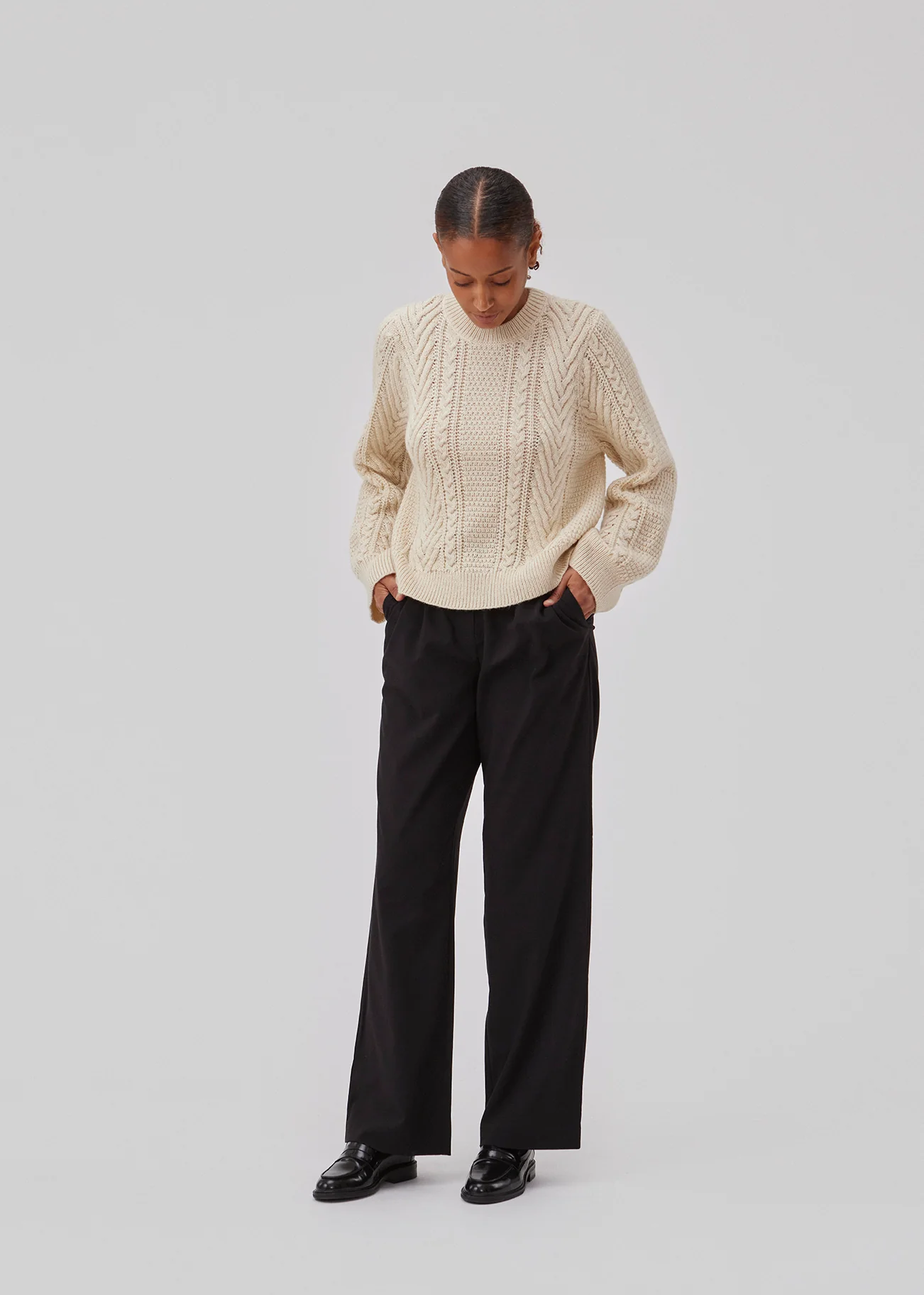 Kabelstrikket trøje i hvid i kvalitet med uld. GrannonMD o-neck har en afslappet pasform med lange ærmer og rund hals, med ribkant ved hals, ærmer og forneden. Modellen er 175 cm og har en størrelse S/36 på.