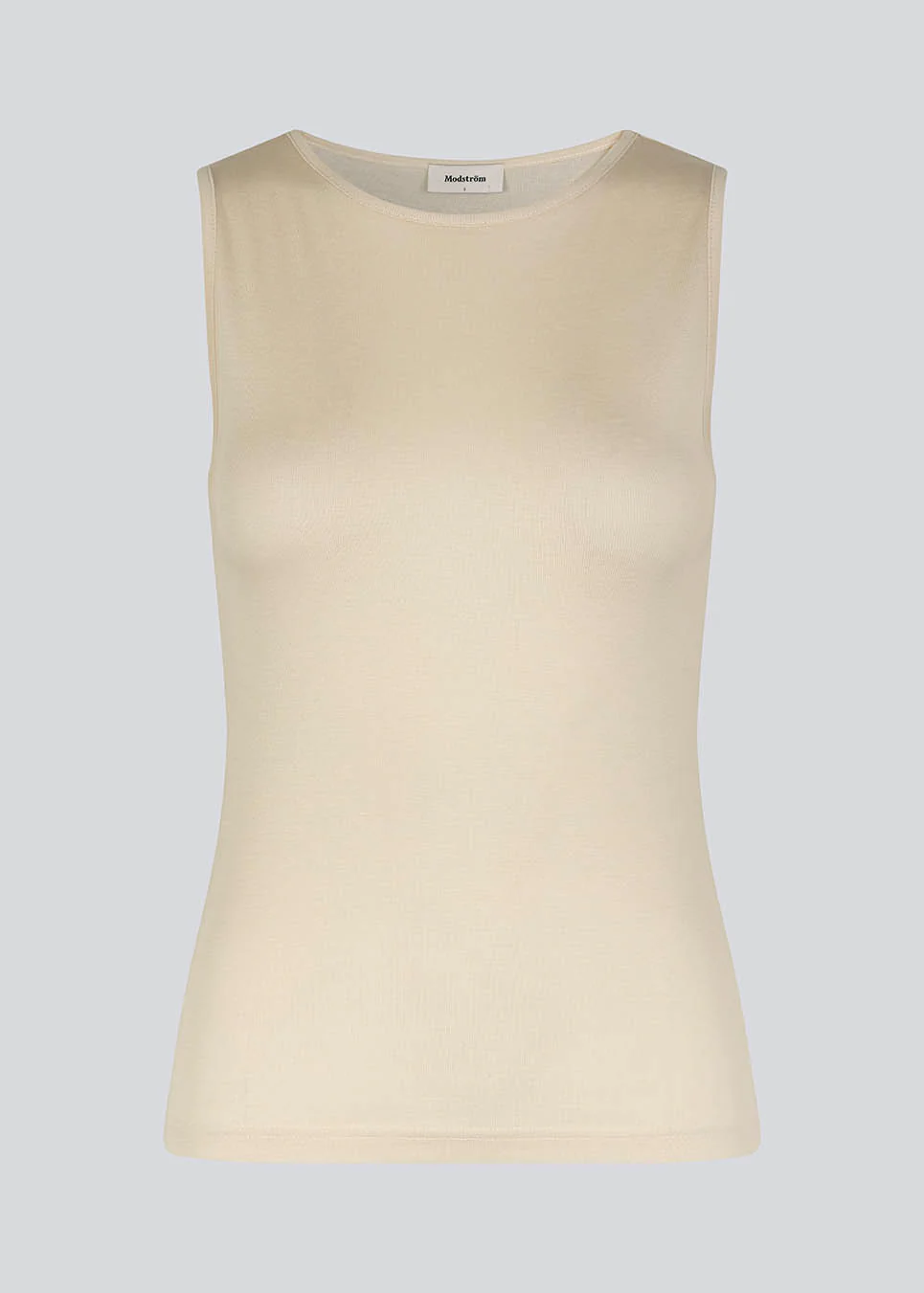 HarperMD top i beige har en tætsidddende silhuet i tynd, blød jersey med høj, rund hals og uden ærmer. Modellen er 175 cm og har en størrelse S/36 på.