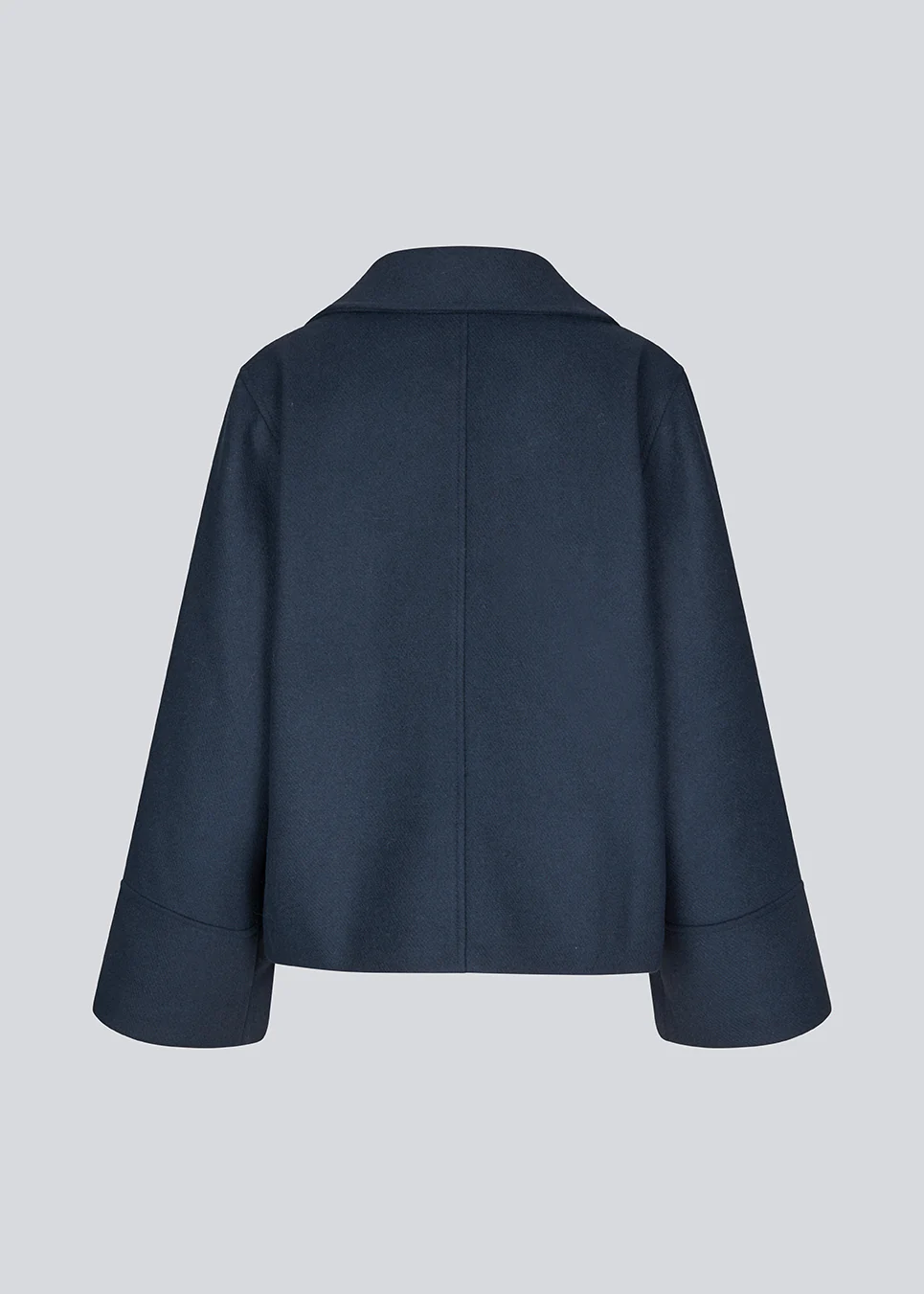 Mørkeblå jakke med løs pasform og brede ærmer i uldblanding. JannaMD jacket har to lommer fortil, krave og en lynlås lukning i siden.