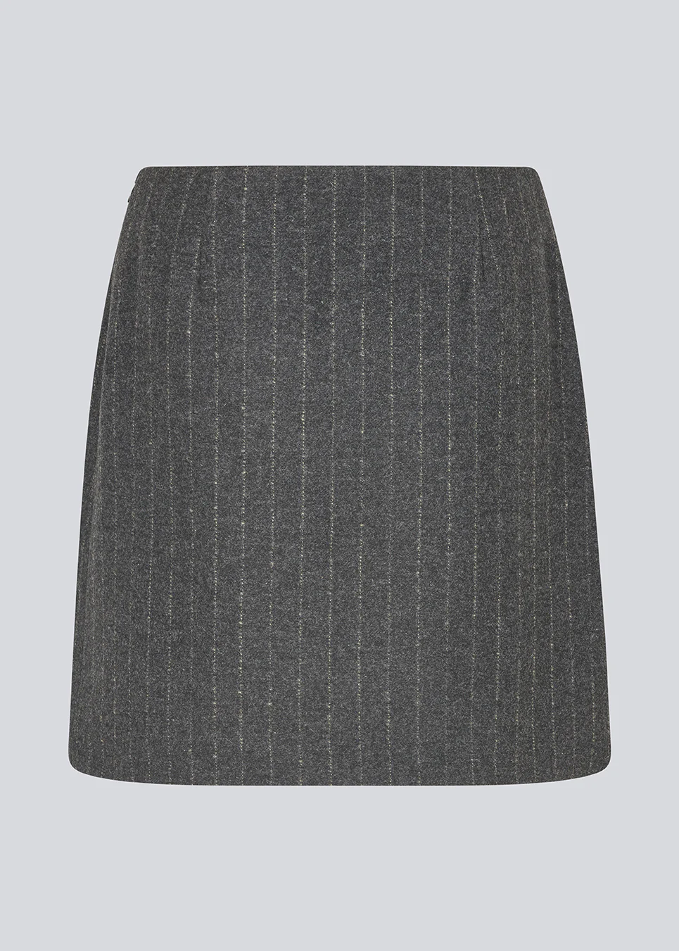 Kort mørkegrå stribet nederdel i uldblanding. KristolMD skirt har foer og en usynlig lynlås i siden. Modellen er 175 cm og bruger størrelse S.