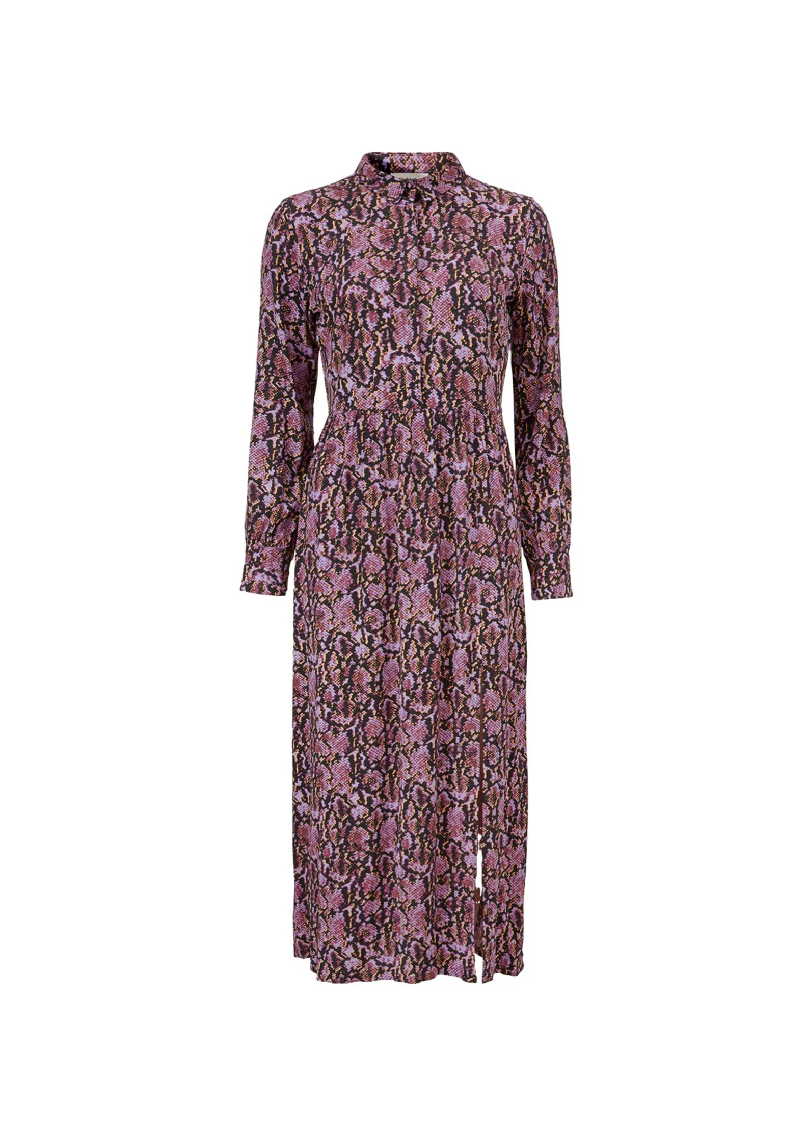 Smuk og feminin skjortekjole i slangeprint med høj slids. Solero print dress har lange ærmer og krave. Kjolen har skjult knaplukning fortil og skæring ved talje. Materialet er i en lækker viskose kvalitet.
