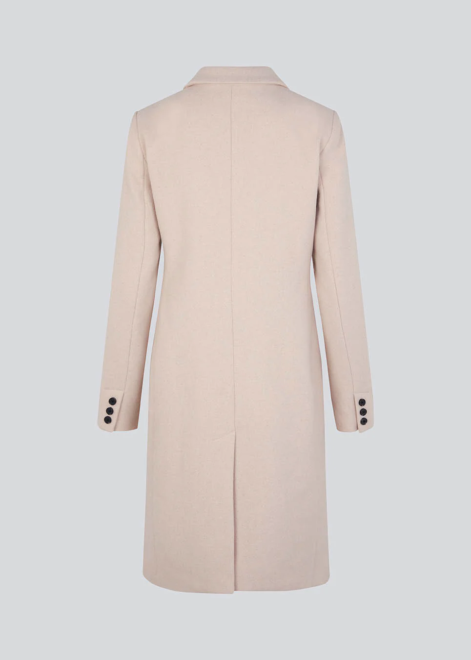 Smuk knælang uldfrakke. Odelia coat, i farven Summer Sand, bliver lukket fortil af fire knapper og er taljeret, hvilket giver et feminint udtryk. På grund af den høje kvalitet af uld, vil den være det oplagte valg til både efterår og de milde vintre.