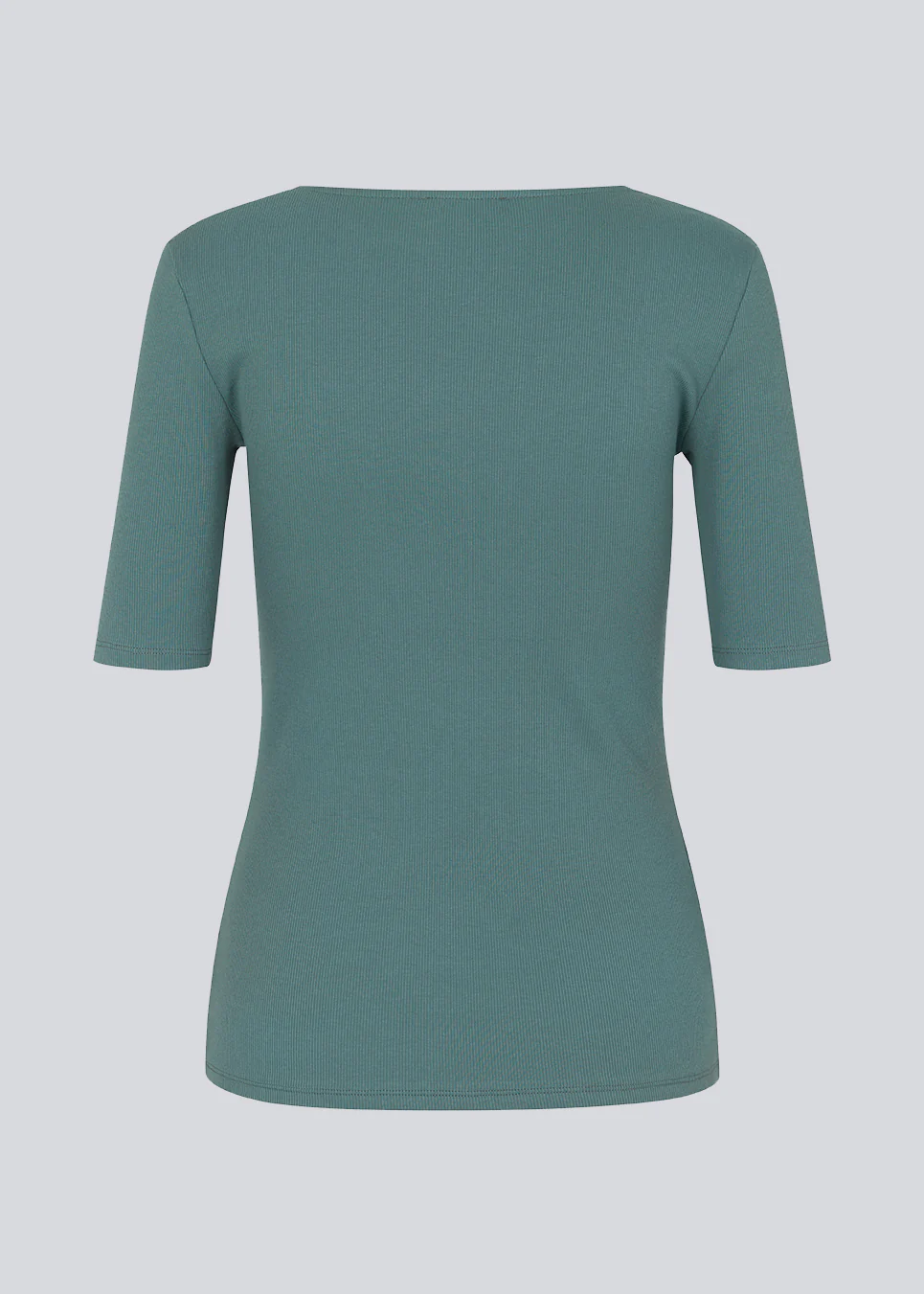 Kropsnær top i blå i ribbet bomuldsjersey med dyb udskæring foran og korte ærmer, som slutter lige over albuen. Modellen er 175 cm og har en størrelse S/36 på.