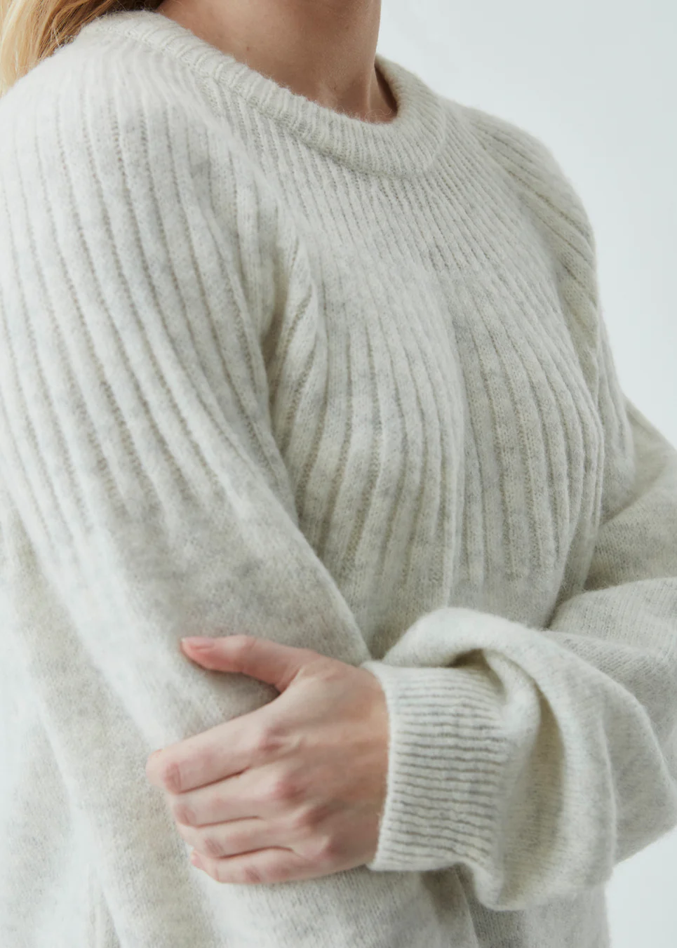 Perfekt strik med mønster ved brystet og ribkant ved både ærmer, hals og bund. Truce O-Neck i farven Off White er en must-have i basis garderoben.